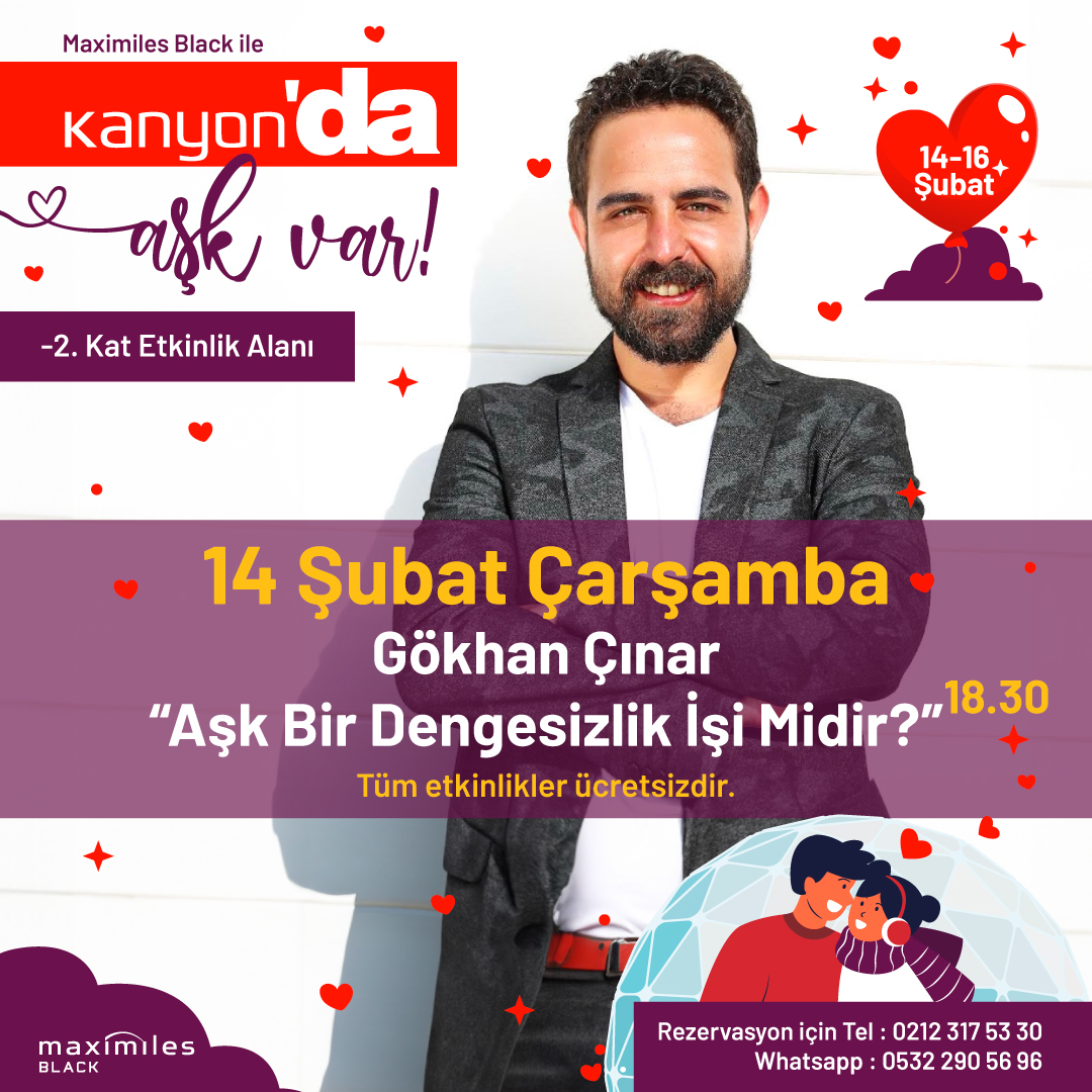 14-16 Şubat tarihleri arasında gerçekleşecek atölyeler, söyleşiler, stand-up gösterisi, akustik konser ve daha birçok sürpriz, seven kalpleri Kanyon’da bir araya getirecek.